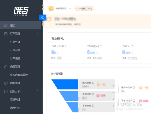 登录当作功后,会显示首页界面,可以看到昨日完当作单量和今日完当作单量,还有营业额数据,而且还能查看昨日流量曝光环境,按照曝光环境阐发并实时调整营销活动。