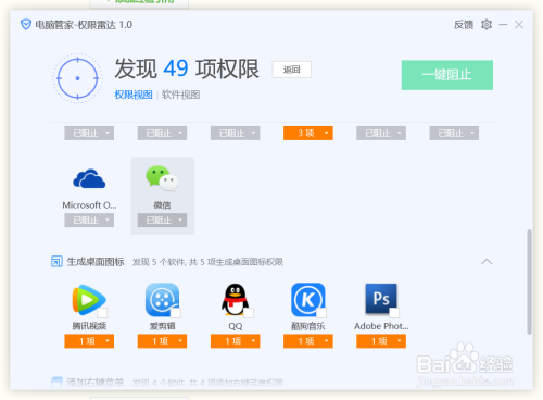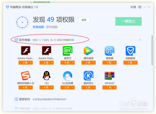检测完之后,第一栏就可以看到哪些软件拥有了弹窗的权限,把不要的软件框选出来,然后点一键阻止即可。
