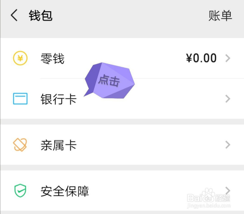 打开微信,点击→我→钱包,进入钱包的本家儿界面,点击【银行卡】功能,选择【添加银行卡】