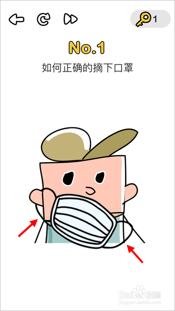本关卡考您会不会摘口罩,这个操作方式就是实际中的操作方式,从一边耳朵起头,把挂在耳朵上带子摘除后再去碰别的一只耳朵,按照这个方式对人物操作即可过关。