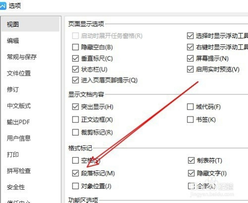 接下来在右侧的窗口中找到段落标识表记标帜的设置项。