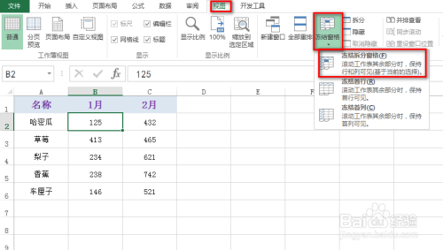 首先鼠标选中B2地点的单位格,然后在“视图”选项卡下找到并点击“冻结窗格”下的小三角,在呈现的下拉菜单中,点击“冻结拆分窗格”,具体如下图所示: