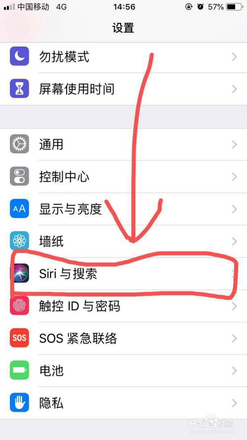 接着点击设置页面里的“Siri与搜刮”。