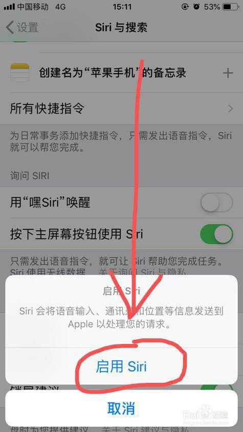 或”按下本家儿屏幕按钮利用Siri“右侧的开关,然后点击”启用Siri“。