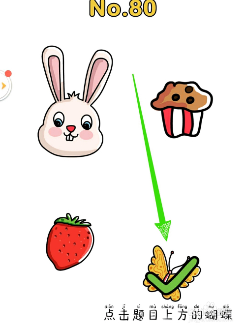第三步,进入80关,我们发现标题问题中有四个图像,不克不及移动,我们将标题问题按住拉到蝴蝶的下方。