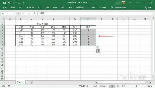 将鼠标移动到排名第1个单位格右下角,呈现十字符号时标的目的下拖动填充完残剩单位格,此时总分排名已显示在排名列。