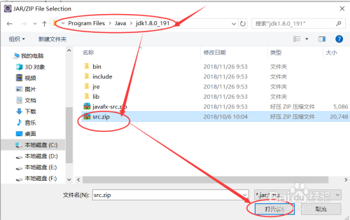 浏览找到本机电脑上Java JDK的安装目次下,找到并选中src.zip文件,点击“打开”,如下图所示: