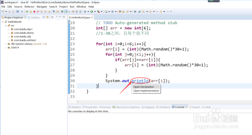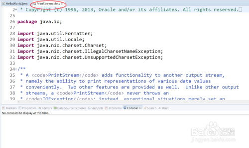 打开Eclipse,编写一些简单的Java代码,然后我们鼠标点击代码中一些系统供给的类,查看类的界说和声明,如下图所示: