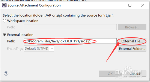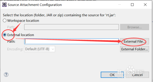 在打开的Source Attachment Configuration对话框中,我们选中“External location”,然后点击“External File...”,如下图所示: