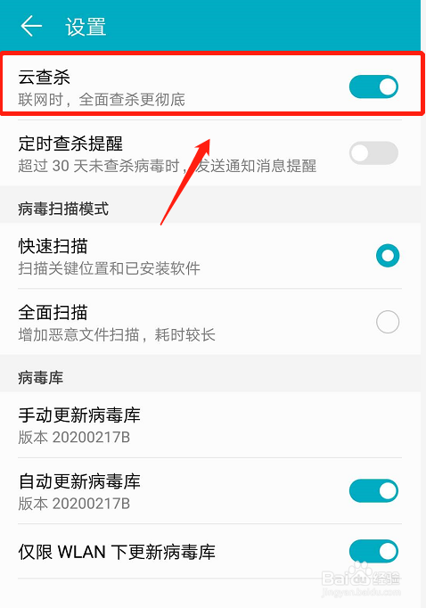 开启按时查杀提醒的同时,建议打开“云查杀”,联网时周全查杀会更彻底。