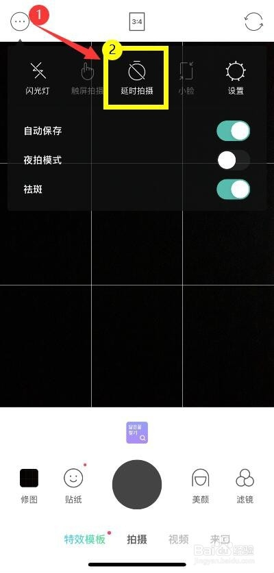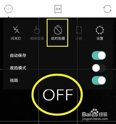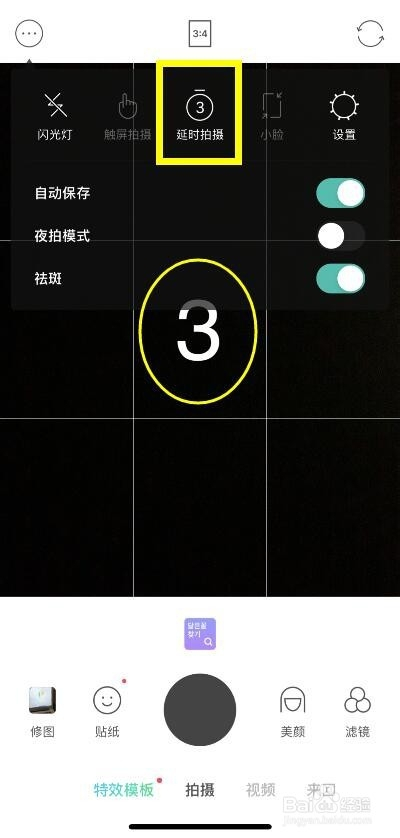 2、在出来的界面中,点击一下延时拍摄,启动后默认延迟3秒;再次点击,延时7秒;再次点击则封闭延时拍摄功能