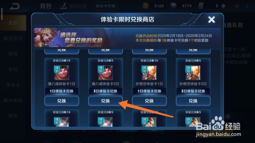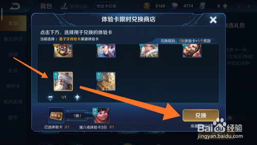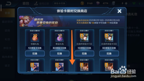 接着,我们在兑换体验卡的页面中下拉列表,寻找本身要兑换的皮肤或者英雄。