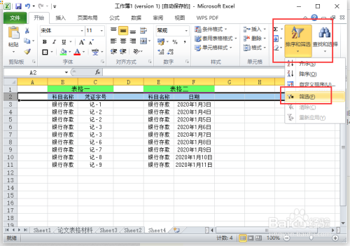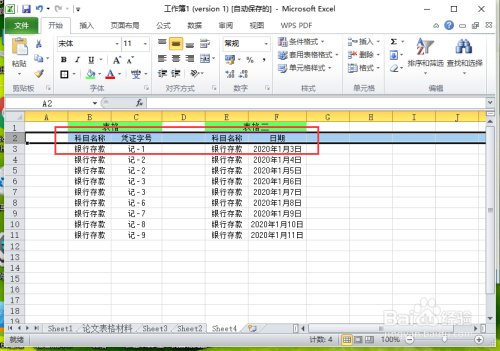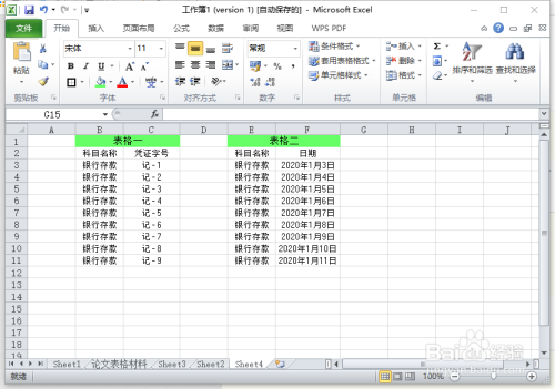 首先,我们打开两张表格,为了便于查看我们把数据放在一个内。一个表格是银行存条目科目及对应的记账凭证号,另一个表格为银行存条目科目和日期。