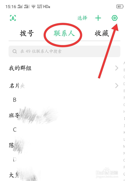第二步:选择【联系人】,选择右上角的【设置】(如下图)