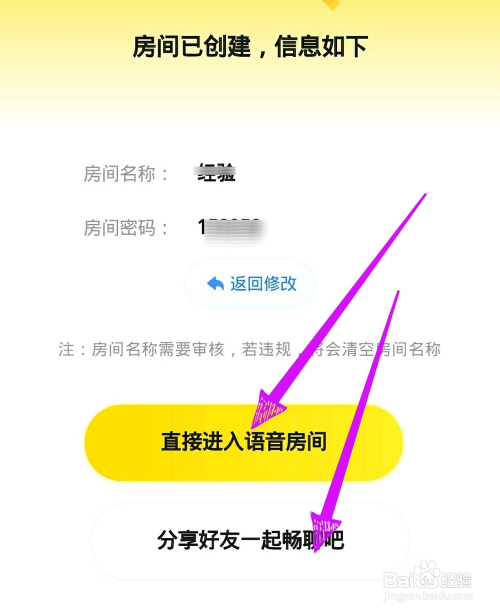 第四步,yyAPP会提醒房间建立当作功,将房间分享给老友,再点击进入房间。