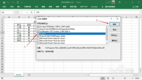在COM加载项里找到“Inquire”,勾选其前面的复选框,点击确定。