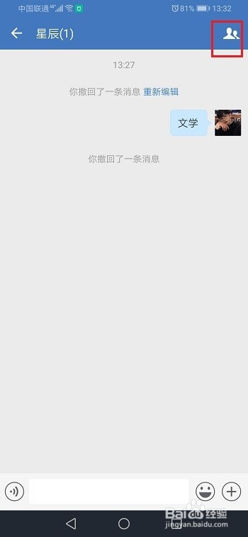 第一步手机上打开企业微信,进去群聊之后,点击右上方的图标,如下图所示: