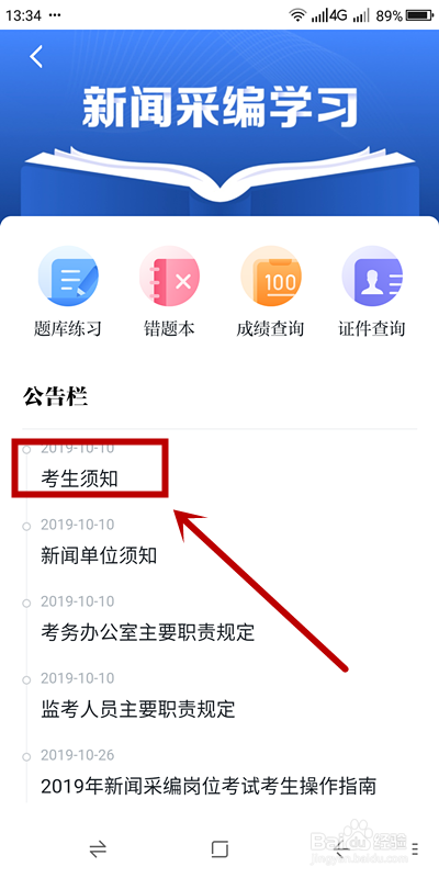 在【新闻采编进修】页面,需要单击查看【考生须知】