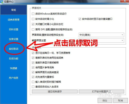 点击右上方的设置,进入设置界面,选择鼠标取词。
