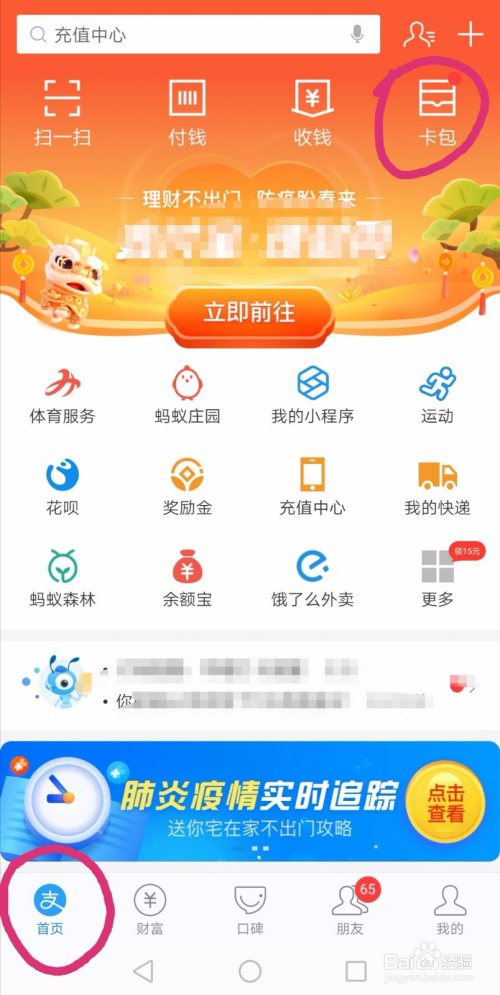 登录支付宝,然后点击首页的卡包。