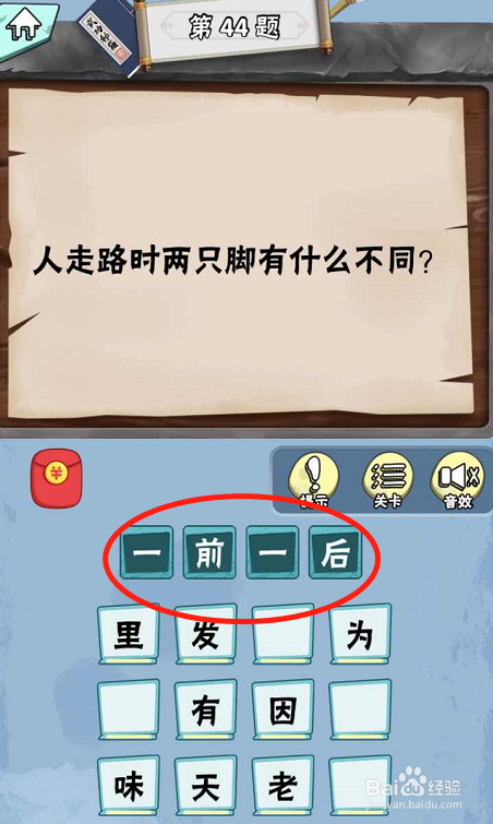 准确谜底是“一前一后”,走路的时辰两只脚当然是一前一后的,这样才可以走路。