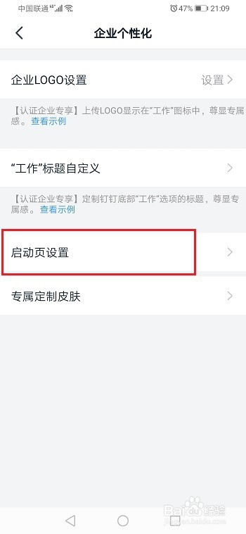 第三步在企业个性化界面,点击启动页设置,如下图所示: