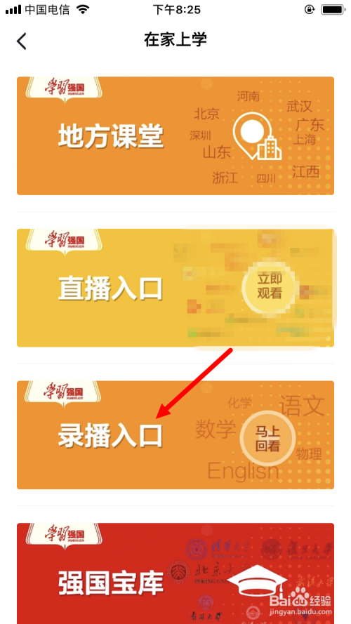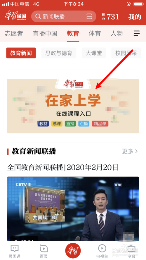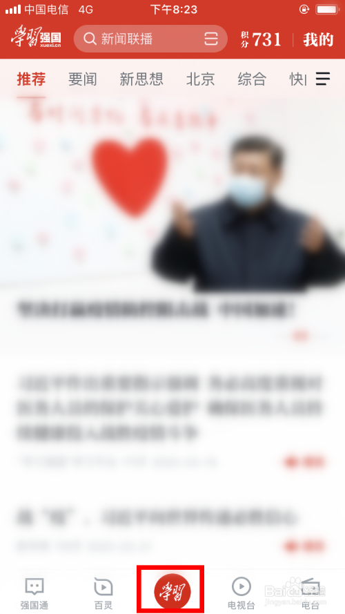首先在手机上打开并登岸学习强国App,并在首页面点击选择【进修】。