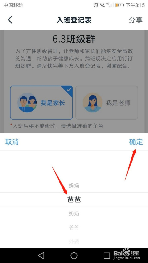 选择本人和学生的关系,妈妈、爸爸、爷爷和奶奶等,然后点击“确定”。