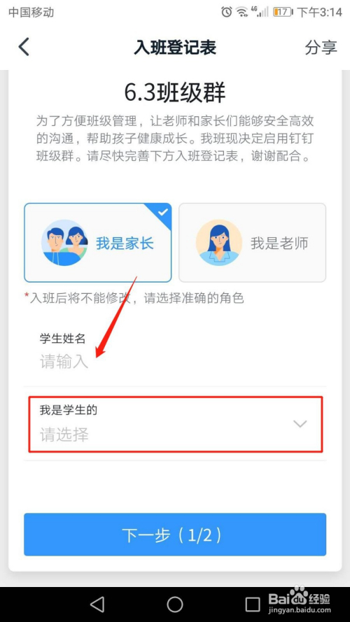 在“入班挂号表”界面,输入学生姓名,然后点击“我是学生的”选项。