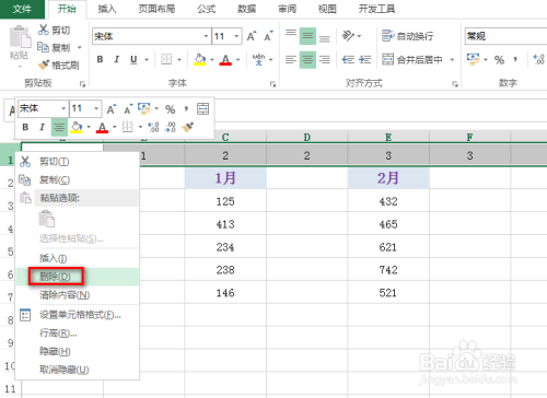 选中数据表格的第一行,鼠标右键,在呈现的下拉菜单中,点击“删除”,具体如下图所示: