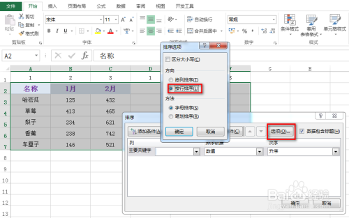 在弹出的对话框中,点击界面右上角的“选项”,在弹出的新对话框中,将“偏向”设置为“按行排序”,其他默认,然后点击“确定”,具体如下图所示:
