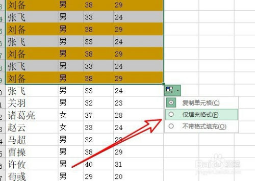 6、然后点击右下角的下拉按钮,选择仅填充格局的选项。