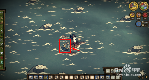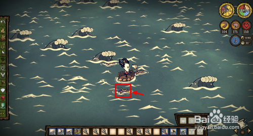 拿出背包中的工具丢在海面上,任何海上漂浮物都有几率呼唤出海怪。这里建议大师用最经济实惠的树枝,像下图那样把树枝一个个丢在船四周。