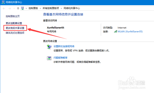在“收集和共享中间”页面,点击“更改高级共享设置”。见下图
