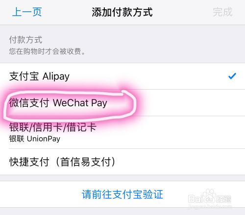 ⑥第六步,进入添加付条目体例页面后,点击下方“微信支付”进行添加即可。