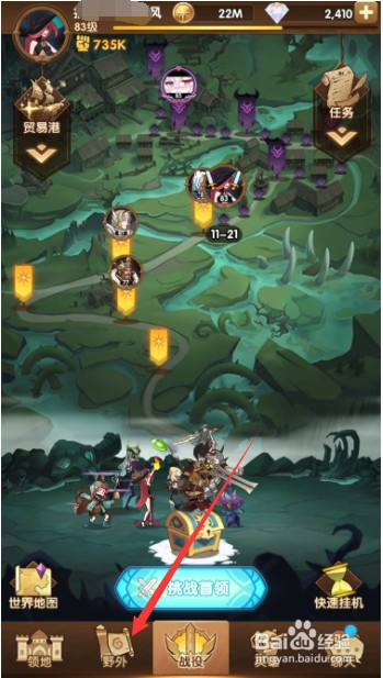 1、打开进入剑与远征之后,点击“野外”,选择此中的“奇境探险”。