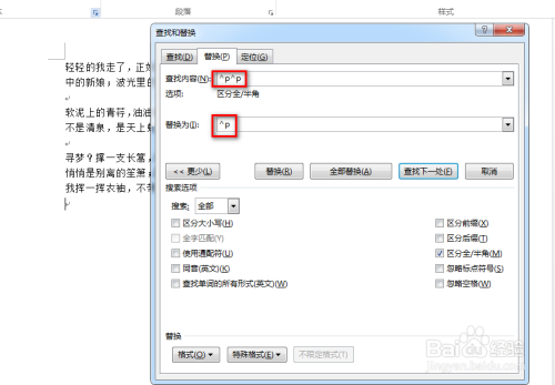 然后将查找内容设置为:^p^p,替代内容设置为:^p,最后点击“全数替代”,具体如下图所示: