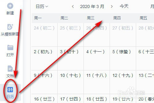 点击左上角的“首页”,在首页左侧列表中找到“日历”功能。