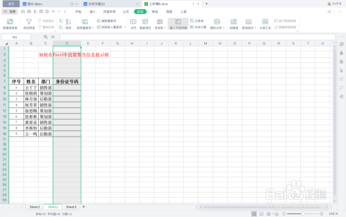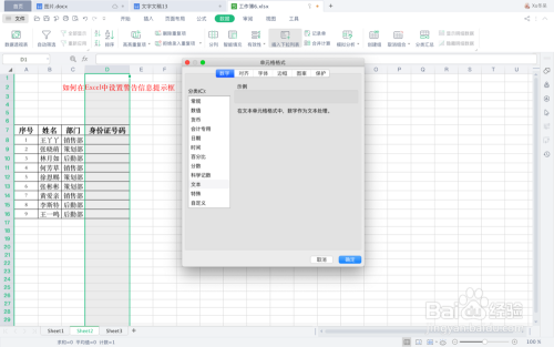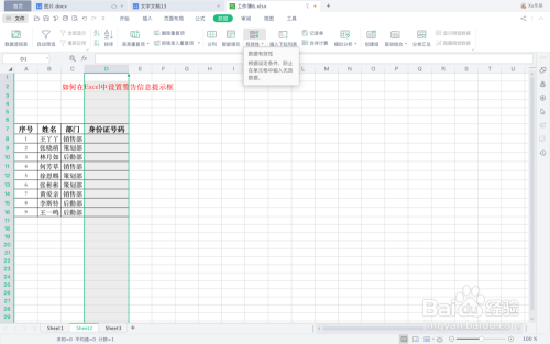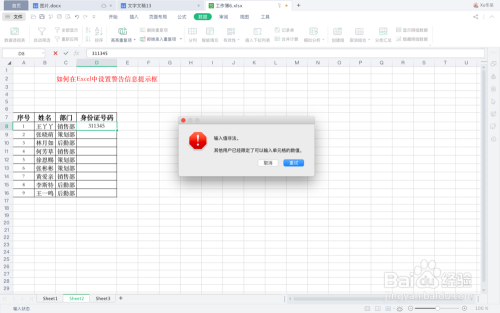 回到表格中,当我们在身份证号码地点列录入一串少于18位的数字,就会弹出一个警示框。