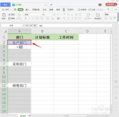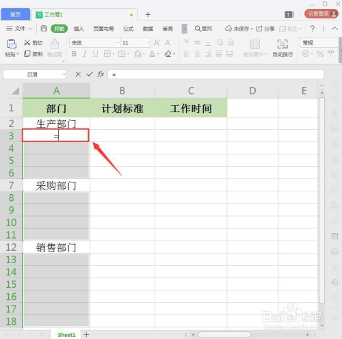 接下来,我们在A3单位中格输入【=】等于号,如图所示。