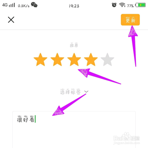 第四步,对影视评分,然后写下我们的评价,点击【更新】,就可以发布短评了。