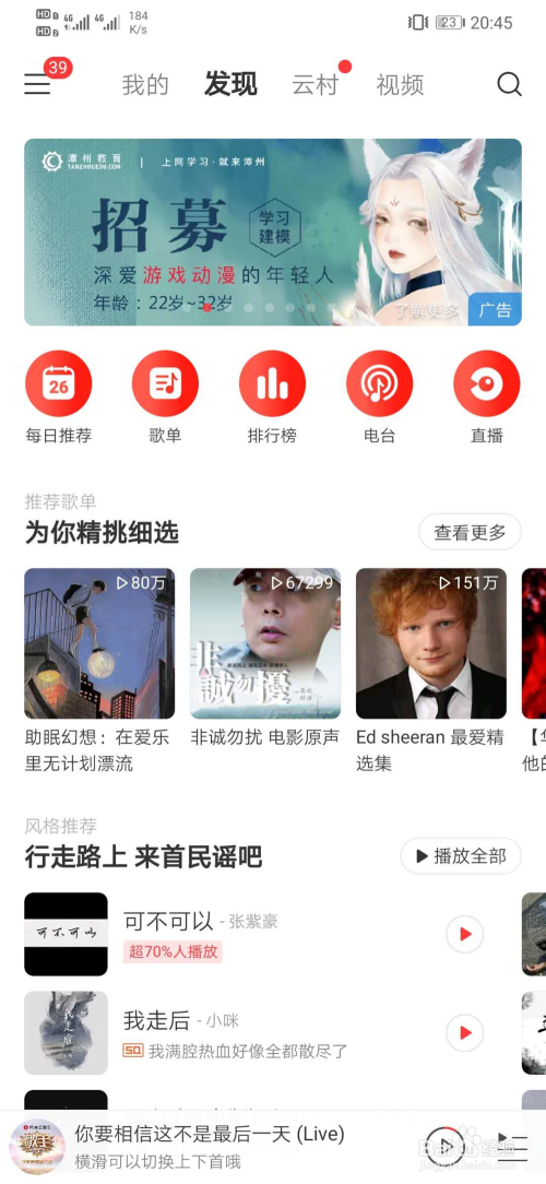 首先下载并登录网易云音乐,如图所示。