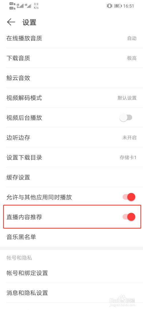 进入设置页面后,滑到直播内容保举位置,如图所示。
