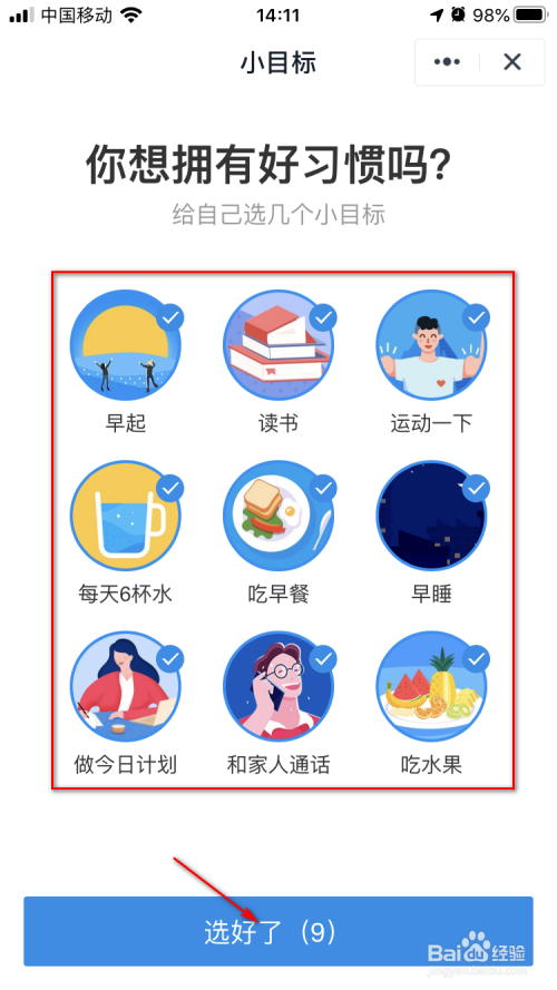 3.然后我们选择几个本身要告竣的每日方针,像夙起,早睡,念书等,点击【选好了】按钮。