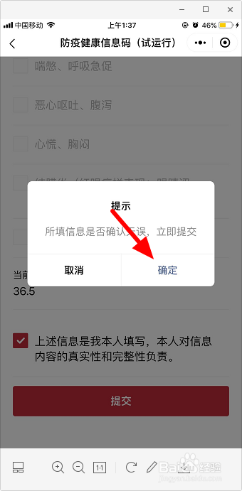 输入小我信息和健康信息,勾选本人填写信息并对其承担,点击“提交”。