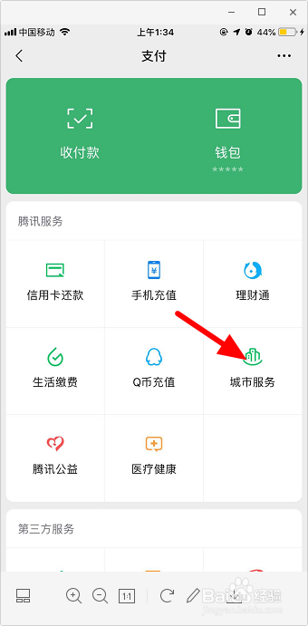 1.打开微信,点击“我-支付-城市办事”。