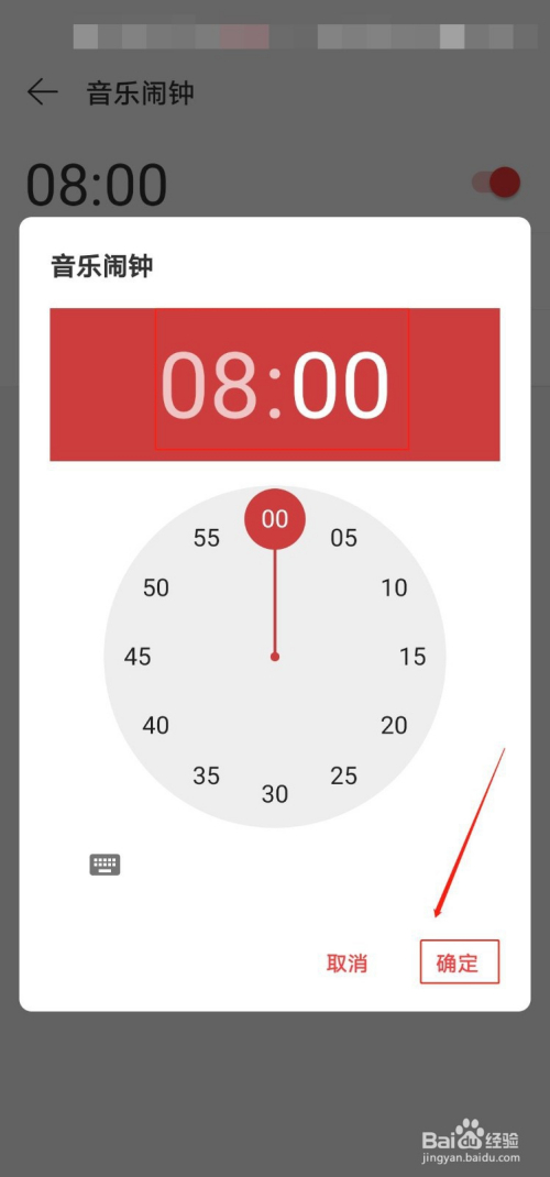 进入音乐闹钟页面后,我们首先设置闹钟时候为早上8点,并点击确定。