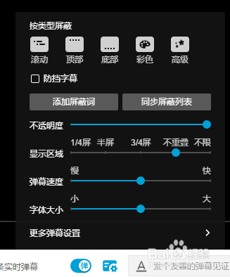 3、字体变大——在播放器下方,点击-弹幕设置-更多弹幕设置,打消弹幕等比缩放。