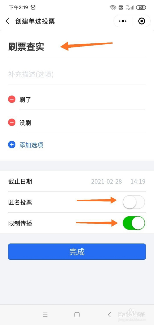 输入投票的题目和选项,然后封闭【匿名投票】,开启【限制传布】。
