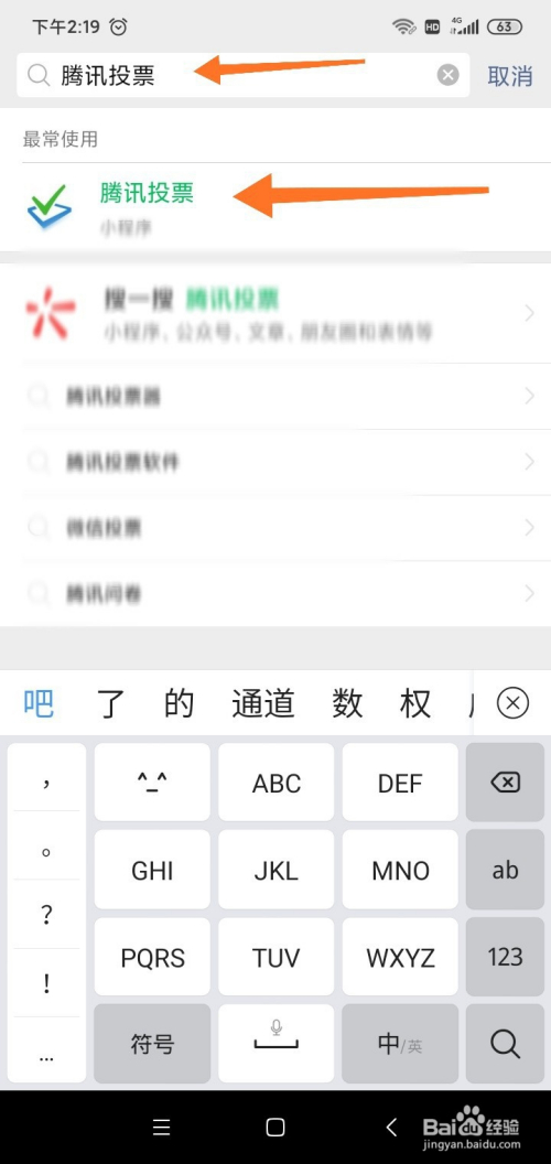 1.打开微信,在搜索框中输入【腾讯投票】,然后点击下方的小程序。